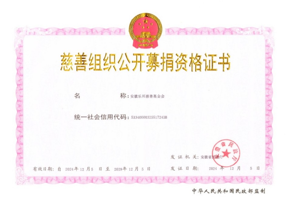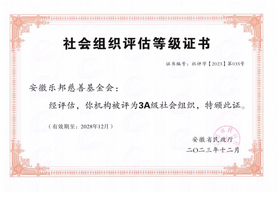 安徽乐邦慈善基金会登记证、等级证书、公开募捐资格证书