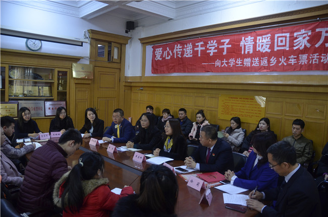 为贯彻落实党的十九大精神,进一步做好大学生精准扶贫工作,让在连的外地贫困大学生能够顺利回家过年,解除他们的后顾之忧,表达党团组织以及社会各界对青年学子们的关怀,1月7日上午在大连团市委一楼举办了主题为“爱心暖学子,情伴回家路”向贫困大学生赠送返乡火车票活动启动仪式。大连市群团组织综合服务中心党委书记、主任单美娜,大连团市委党组成员、副书记曲洋出席仪式并讲话。来自全市各高校团委的老师和受助学生代表参加了活动。